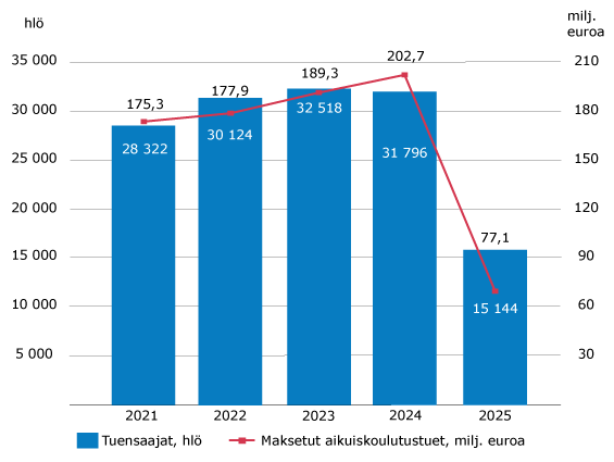 Maksoimme aikuiskoulutustukea 15 144 (31 796) henkilölle yhteensä 77 (203) miljoonaa euroa. Aikuiskoulutusetuuksien lakkautuksen vuoksi vuonna 2025 tukea voitiin myöntää enää palkansaajille ja päätoimisille yrittäjille, joiden opinnot ja tukioikeus olivat alkaneet viimeistään 31.7.2024.