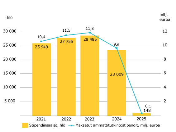 Myönsimme ammattitutkintostipendejä 148 (23 009) henkilölle vuonna 2025. Maksoimme stipendejä yhteensä 0,1 (9,6) miljoonaa euroa. Ammattitutkintostipendejä voitiin myöntää enää 31.7.2024 mennessä suoritetun ammatillisen tutkinnon perusteella.