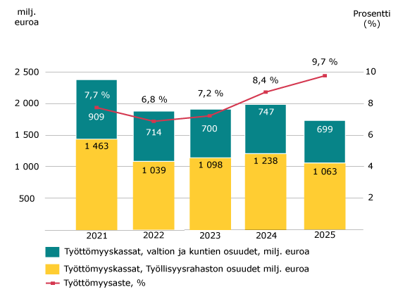 Vuonna 2025 rahoitimme työttömyyskassojen maksamaa työttömyysturvaa yhteensä 1 762 (1 985) miljoonaa euroa, sisältäen valtion ja kuntien osuudet. Laskua edellisvuoteen oli 11,2 % mikä johtuu erityisesti hallitusohjelman toimenpiteiden vaikutuksista.