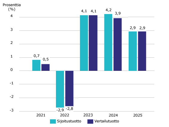 Vuonna 2025 sijoitustemme tuotto oli 2,9 (4,2) %. Sijoitustemme tuotto oli samalla tasolla kuin sijoitustoimintamme vertailutuotto 2,9 (3,9) %, mutta jäi hieman sijoitussuunnitelmamme kirjatusta tuotto-odotuksesta 3,2 (3,6) %.