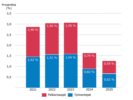 Työnantajan keskimääräinen työttömyysvakuutusmaksuprosentti oli vuonna 2025 0,62 ja vuonna 2026 0,92. Palkansaajan työttömyysvakuutusmaksuprosentti oli vuonna 2025 0,59 ja vuonna 2026 0,89.