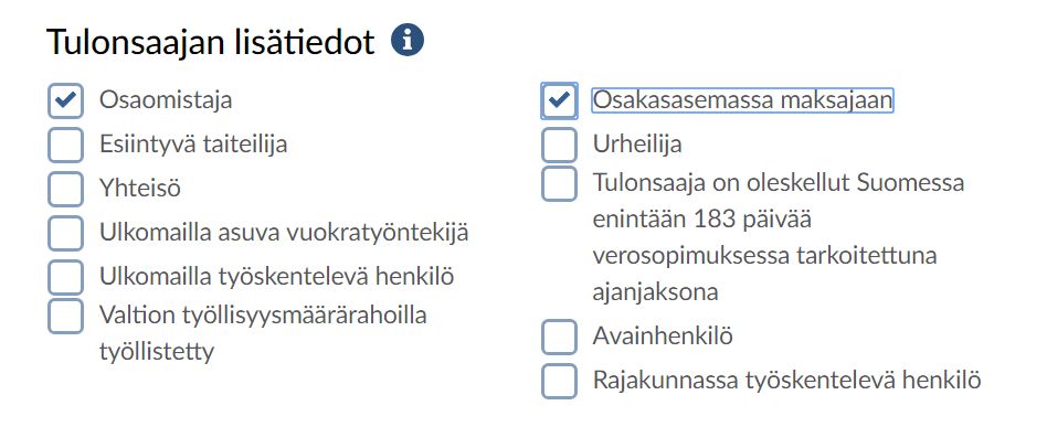 Jos olet osaomistaja, ilmoita tulorekisteriin osaomistaja-tieto kohdassa tulonsaajan lisätiedon tyyppi: osaomistaja. Asiointipalvelussa tiedot ovat kohdassa Näytä tarkemmat tulonsaajan tiedot.